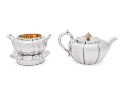 comprising a teapot with an erased makers mark but hallmarked for London, 1836 together with a covered sugar and stand marked for London, 1834.
