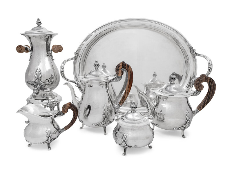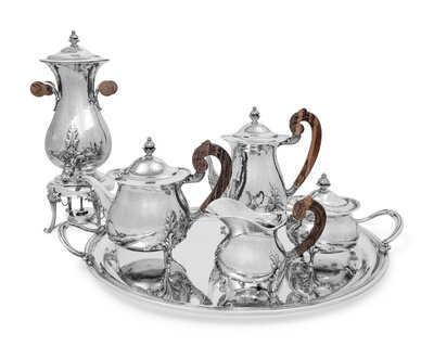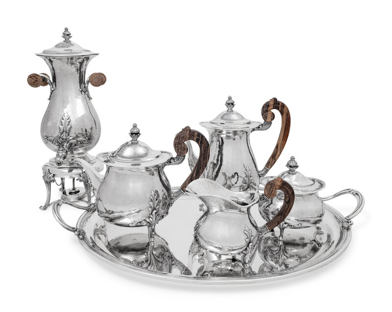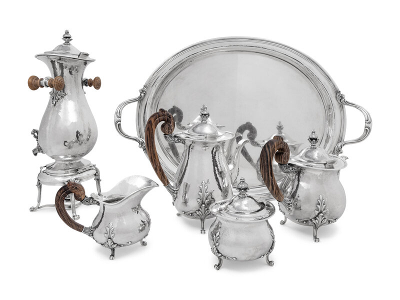 comprising a hot water urn on stand, coffee pot, teapot, creamer, covered sugar, and serving tray.