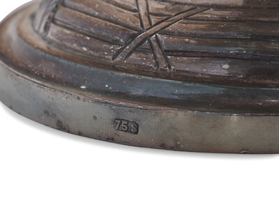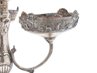 the centerpiece with four tiered compotes, with repousse decoration depicting hunters with African game animals, marked to base, "75.S"; and two silver-plated dishes, apparently unmarked.
