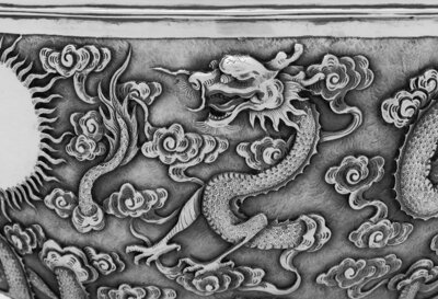 having a circular rim, repoussé decorated with writhing dragons.