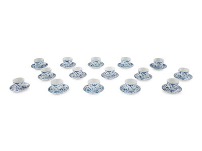 comprising 20 teacups and 24 saucers, each with green crown and blue three wave marks to underside.