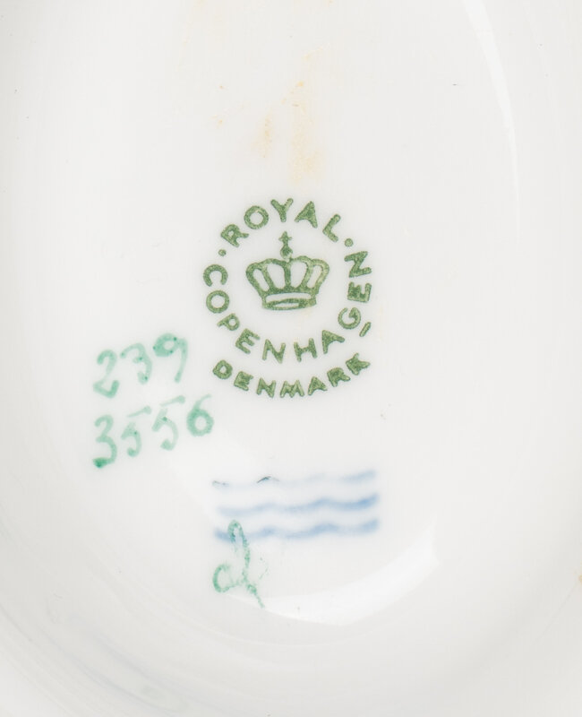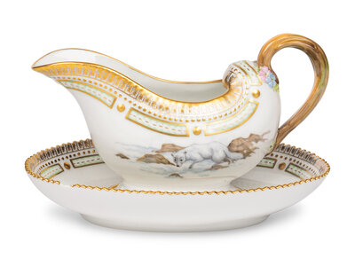 having an affixed underplate; the body decorated with cervus capreolus (Roe deer) and canis lagopus (arctic fox); stamped to underside with crown and three wave marks and painted pattern number 239/3556.