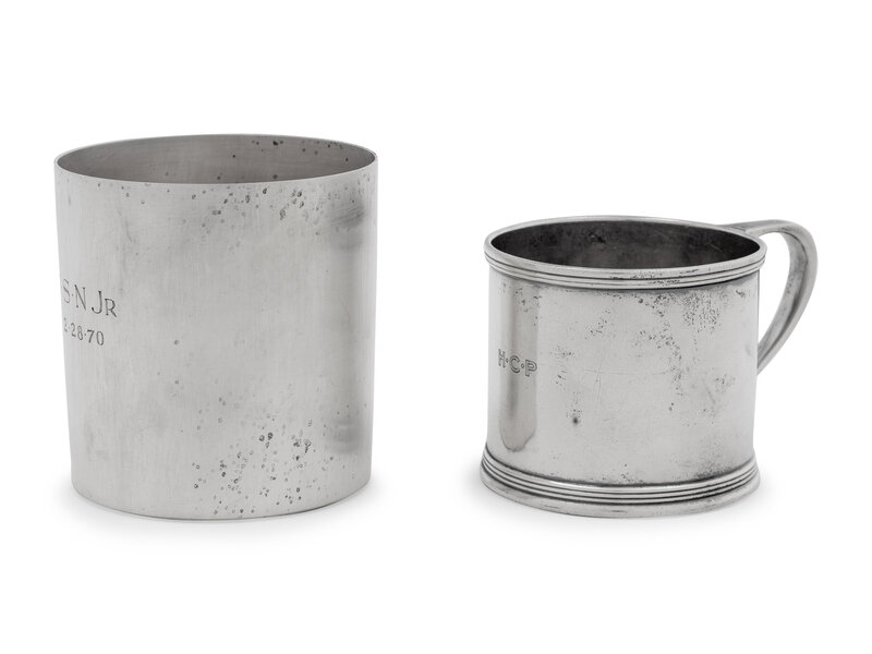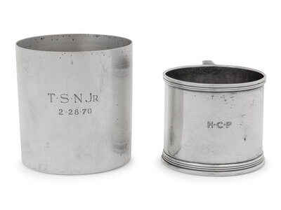 comprising a handled cup, engraved with 'H C P' monogram, and a tumbler, engraved 'TSN Jr./2-28-70'.