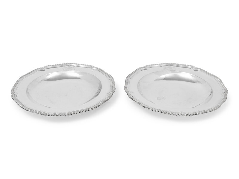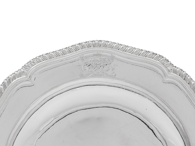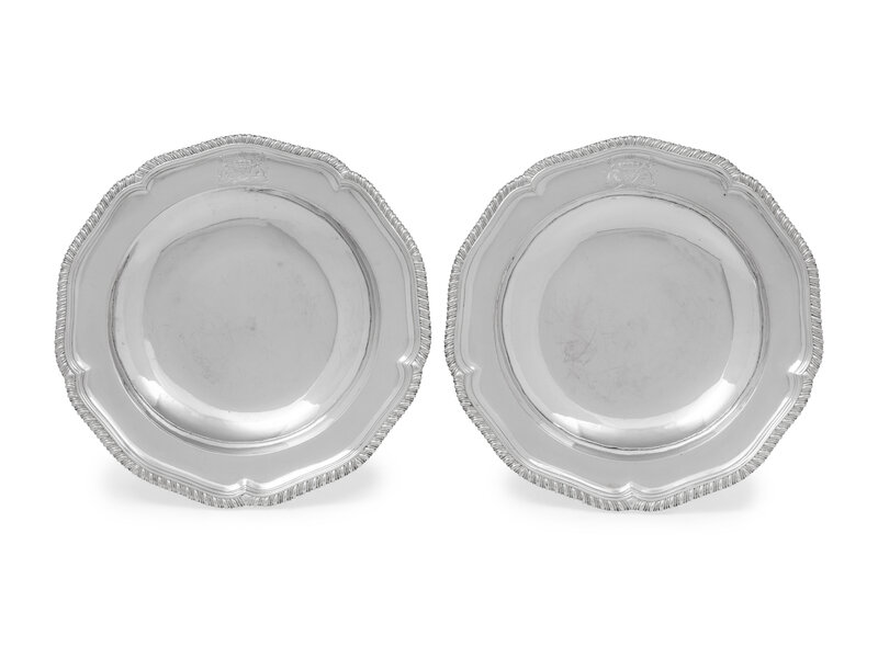 each having an undulating gadroon rim, the boder with a coat of arms surmounting the motto 'Fortis Sub Forte Fatiscet' likely for John Fitzpatrick, 2nd Earl of Upper Ossory (1745-1818).