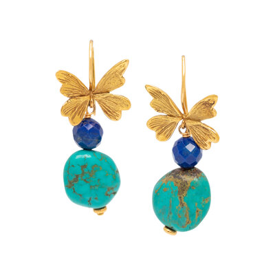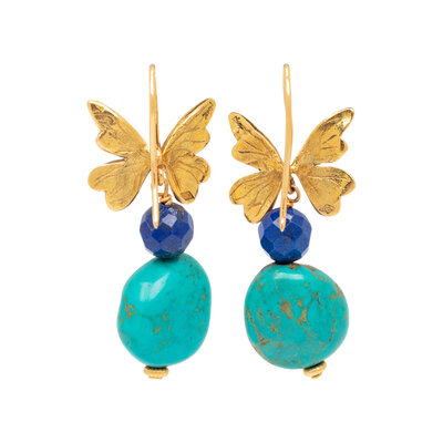 Butterfly-motif drop earrings in gold-tone metal with blue composite beads and turquoise stones. Hook backs. Stamped "YSL" at back of butterfly wings.