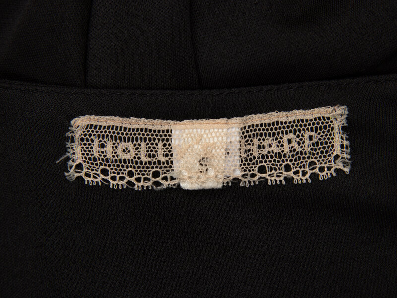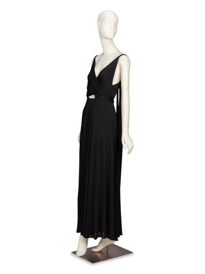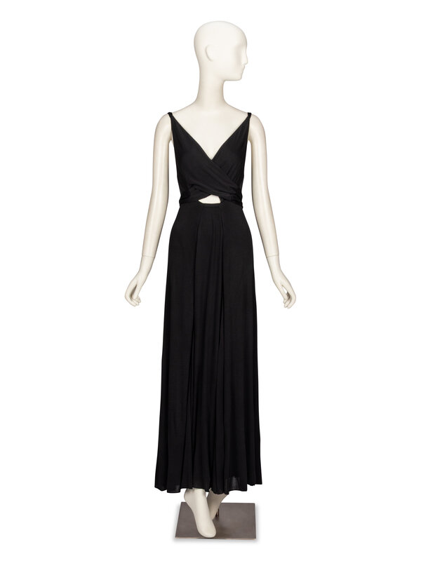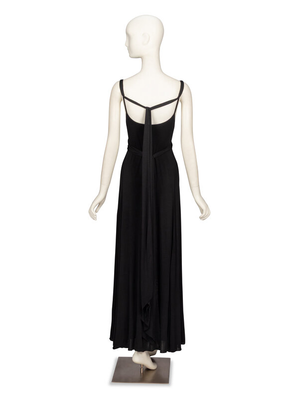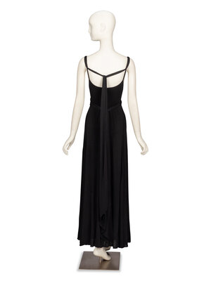 Floor-length gown in black jersey knit. Front bust wrap with two long ties, wrapping & tying at the back. Small cutout at front waist. Full-length A-line skirt. Extra ties at backs of shoulder straps. Fully lined.