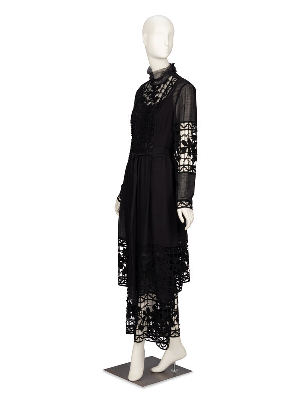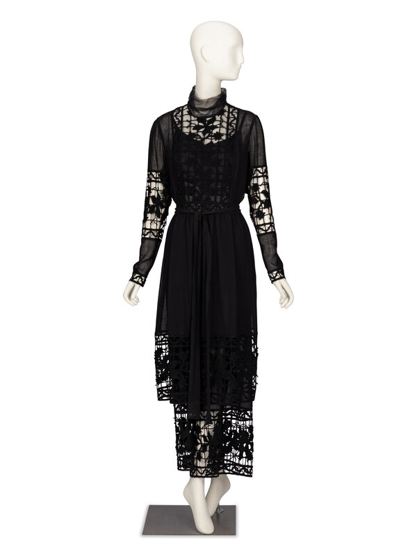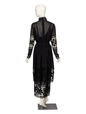 Two-piece ensemble in semi-sheer black wool georgette with black open-work woven insets throughout. Dress has long sleeves, high stand collar in black nylon tulle with button closures, an invisible zipper closure at back, and a self-fabric attached belt at waist. Jumpsuit has spaghetti straps, wide legs with crocheted hems, and invisible zipper closure at back. Both are partially lined.