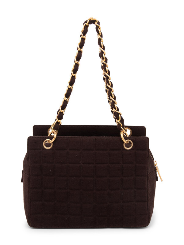 Chocolate Bar handbag in deep brown quilted wool jersey with brushed gold-tone hardware. Zipper closure and interwoven metal-jersey straps.
