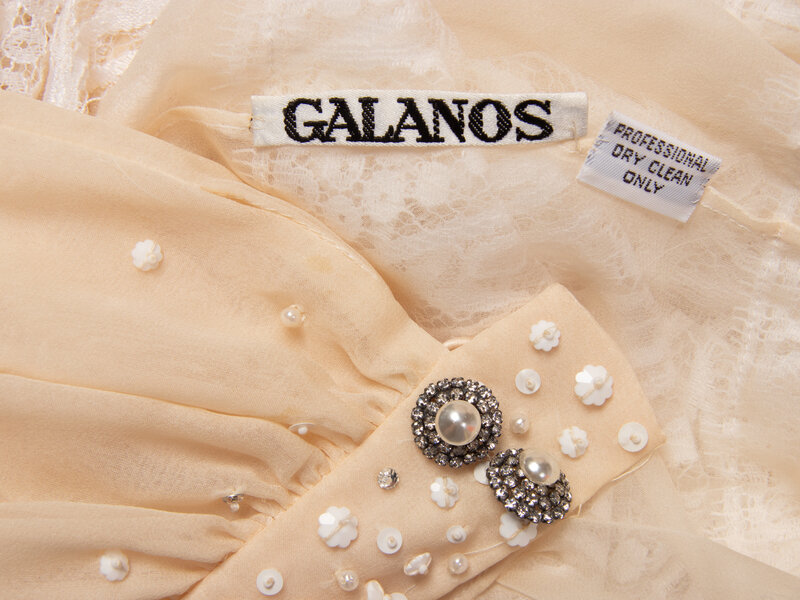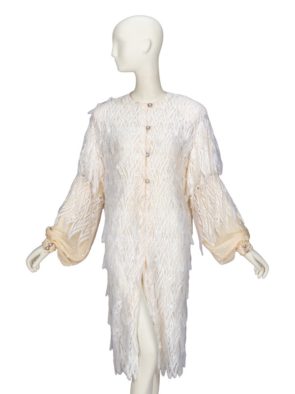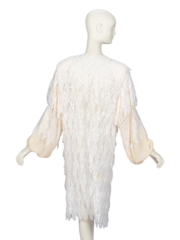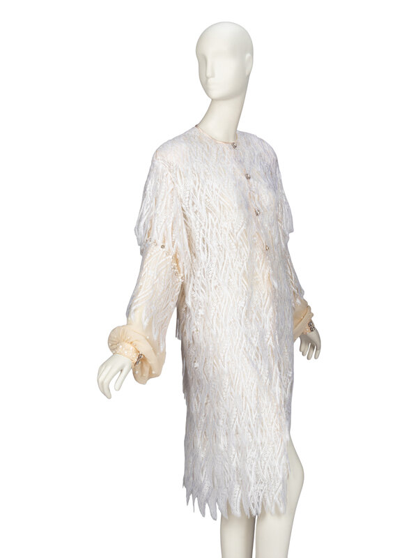Knee-length cocktail dress in layers off white pointed lace; sleeves in cream chiffon with bead embellishments throughout. Round collarless neckline. Heavy padding at shoulders. Full length bishop sleeves with double-buttoned cuffs. Four button closures at front and one concealed hook-and-eye closure at neckline. Rhinestone studded & faux-pearl buttons throughout. Fully lined in cream silk chiffon.