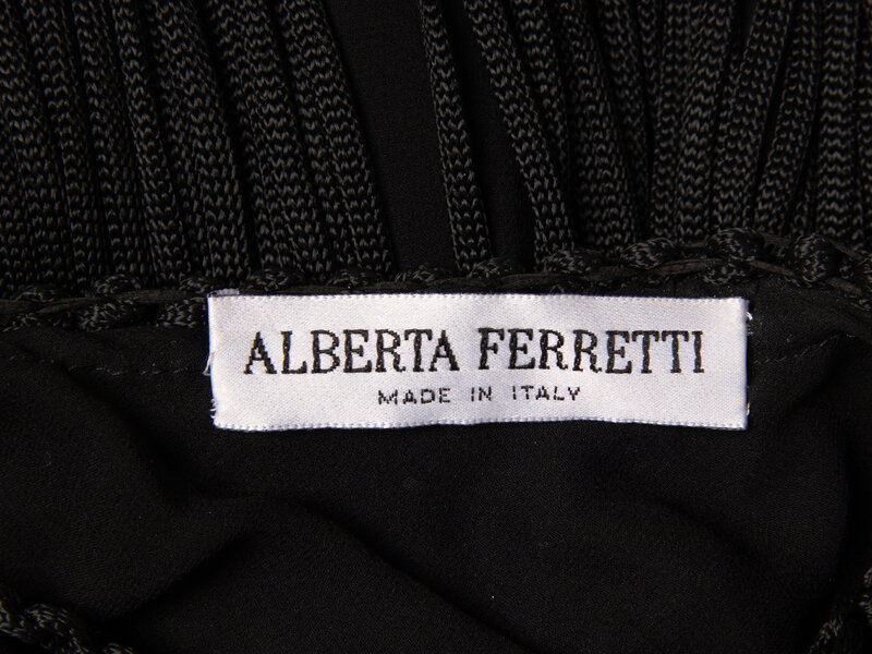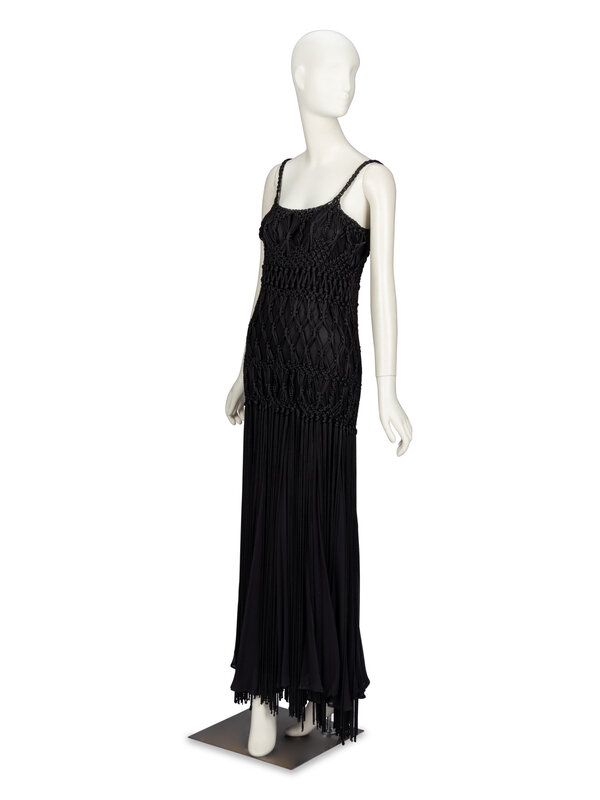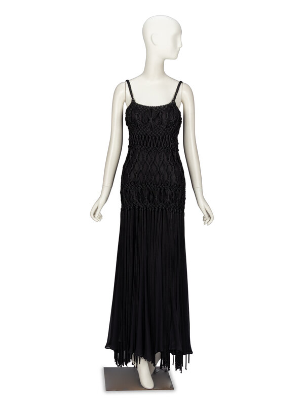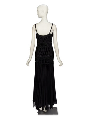 Sleeveless gown in black macraméd cords with long fringe trim at hips; under-dress in black silk chiffon. Slight natural stretch to macramé exterior and under-dress. Slits in under-dress skirt. No closures. Fully lined.
