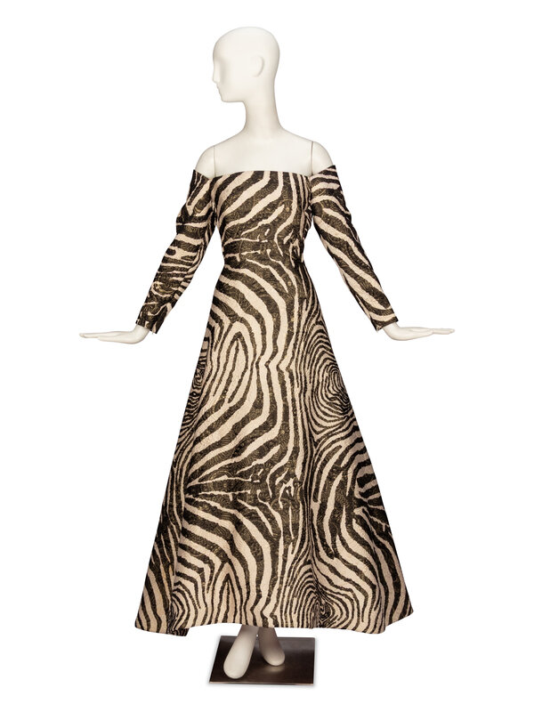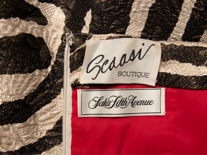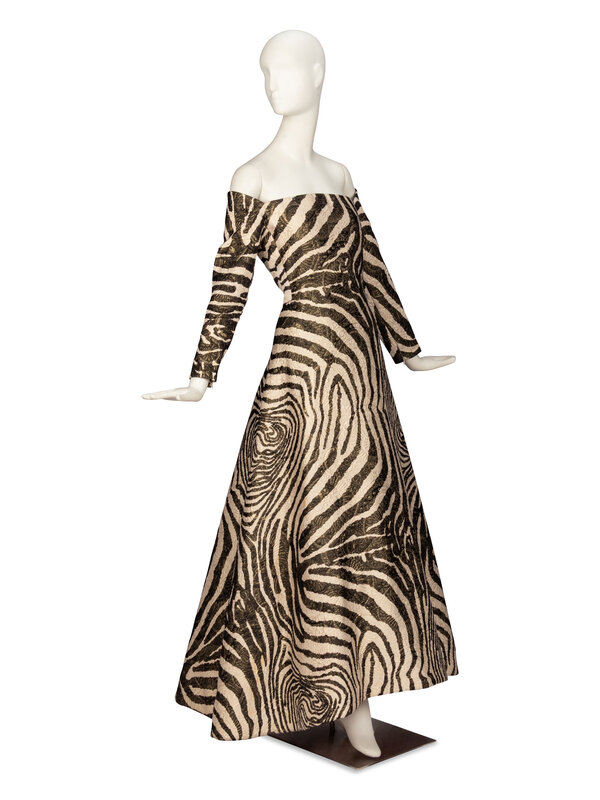 Evening gown in zebra-print gold brocade. Features a square Juliet neckline and three-quarter length sleeves with invisible zipper closures at both sleeve hems. Boning throughout bodice; grosgrain waist stay at interior. Flared skirt with red tulle crinoline underneath. Invisible zipper and hook-and-eye closures at back bodice. Fully lined in red silk habotai.