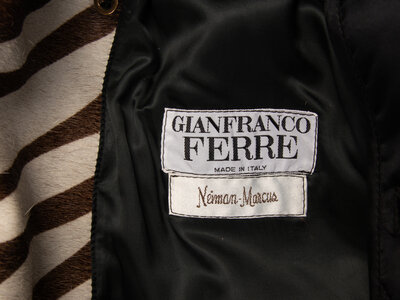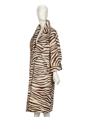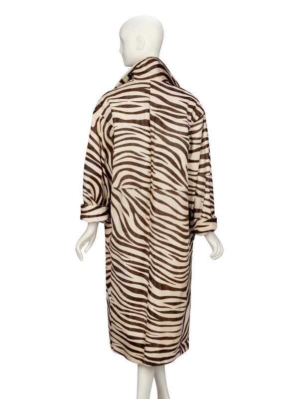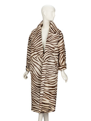 Open-front overcoat in zebra-printed pony hide. Knee-length. Spread collar with notched lapels. Full-length sleeves with optional turn-up cuffs. Two welt pockets. Features removable quilted lining, removable via buttons. Fully lined otherwise.
