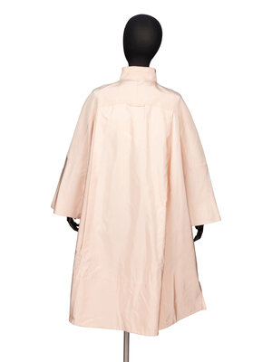 A-line swing coat in pale pink silk faille. Stand collar. Wrist-length incorporated kimono-style sleeves. Two welt pockets at front. Decorative piecing & topstitching throughout. Button closures at front. Fully lined.