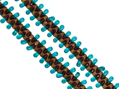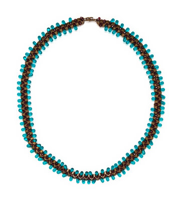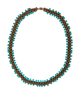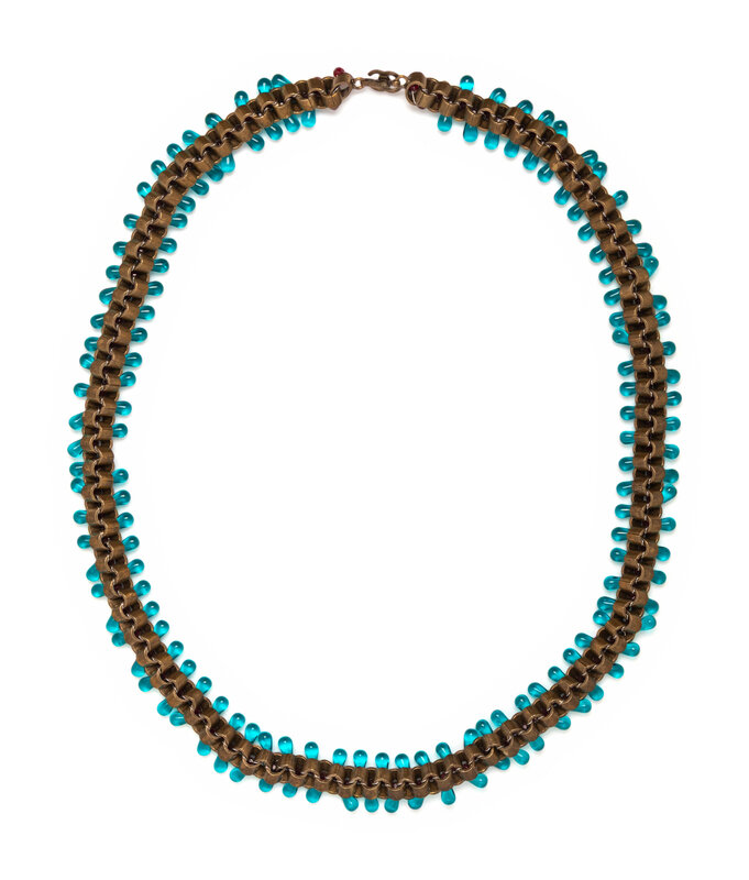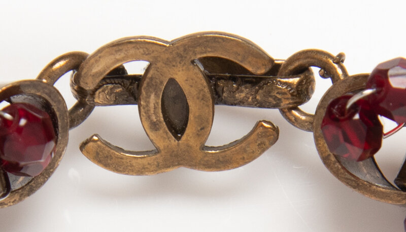 Necklace in bronze-tone metal with clear teal and deep red faceted beads. CC logo open hook closure. Stamped "CHANEL / MADE IN FRANCE" at inside of hook closure.