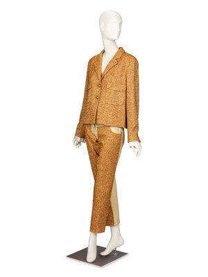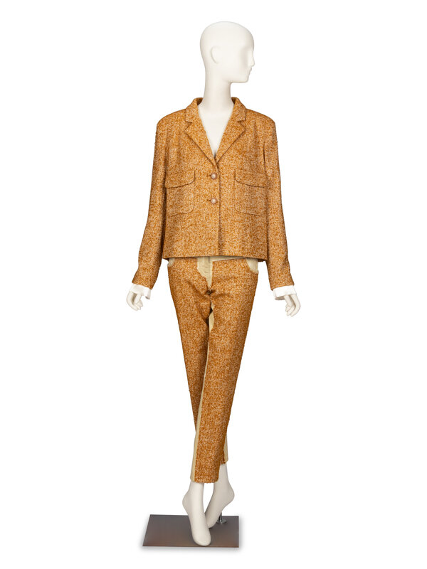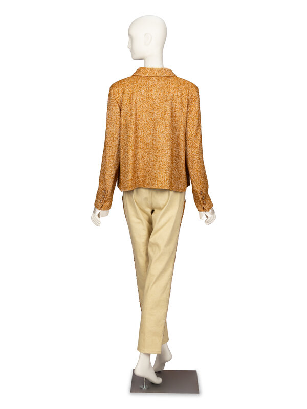 Boxy jacket in ochre wool-blend tweed. Notched lapels. Light padding at shoulders. Full-length set-in sleeves with working three-button cuffs; also features removable white satin extended faux-shirt cuffs. Two patch pockets with flaps at front. Two button closures at front. Wooden & metal buttons throughout. Metal chain weight at interior hem. Fully lined in tonal silk jacquard.