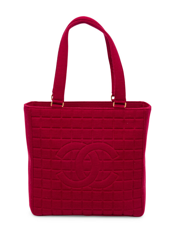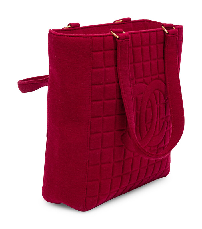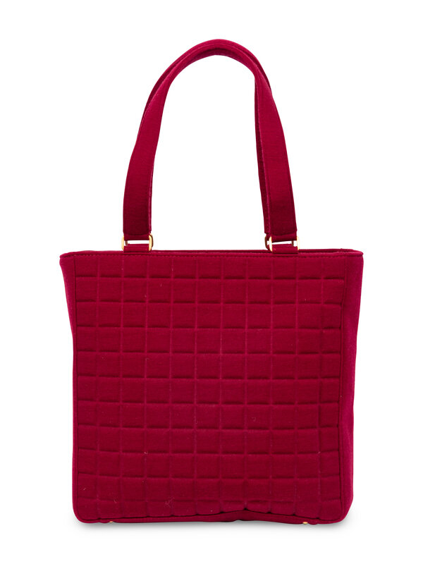 Chocolate Bar tote bag in quilted burgundy wool jersey knit with brushed gold-tone hardware. Zipper closure and flat handles.