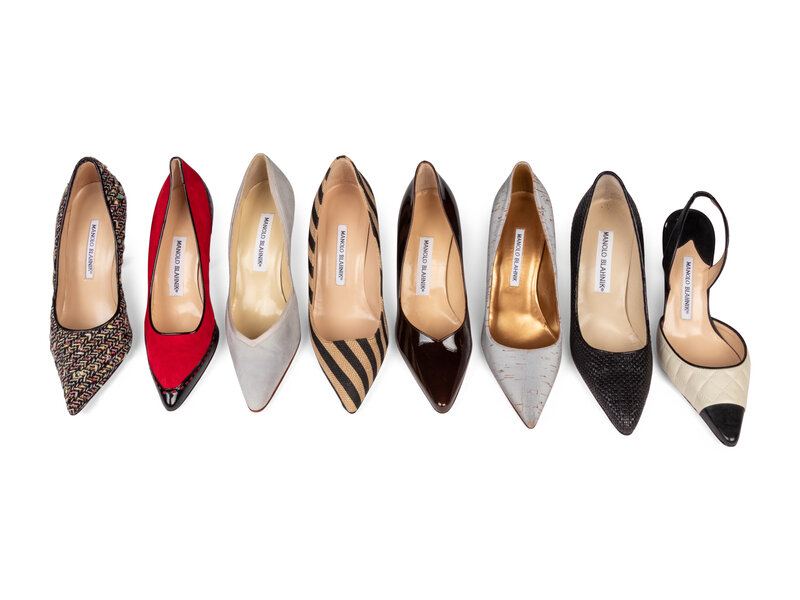Black and tan diagonally-striped linen pumps. Pointed toe and stiletto heel.