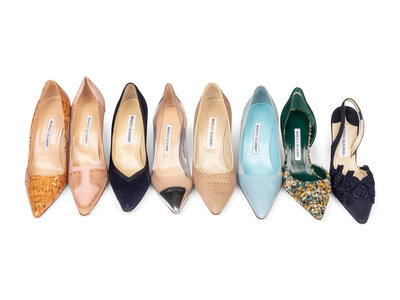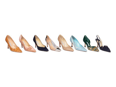 D’Orsay pumps with emerald green velvet and multicolor tweed vamps and trim. Pointed toe and slim heel.