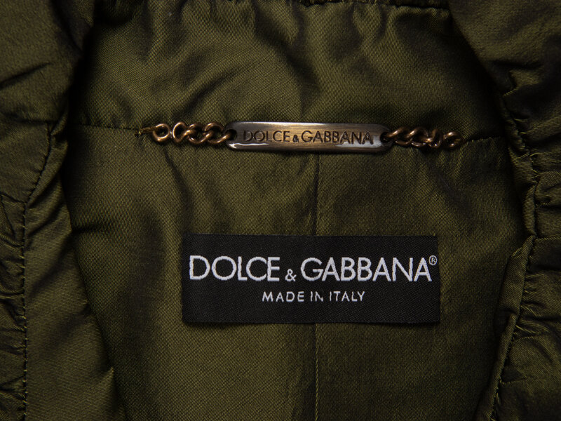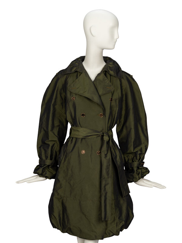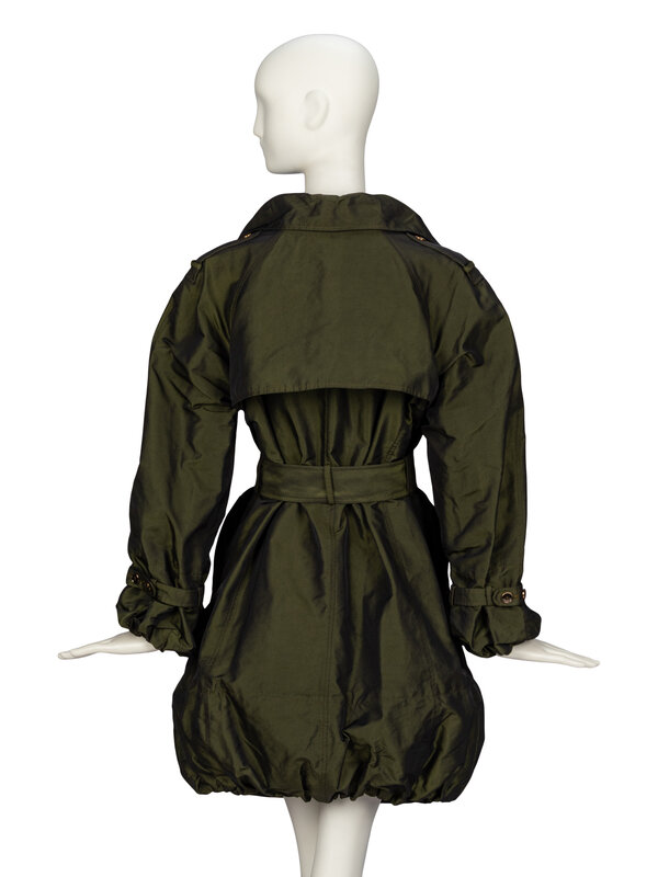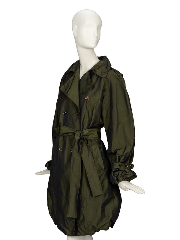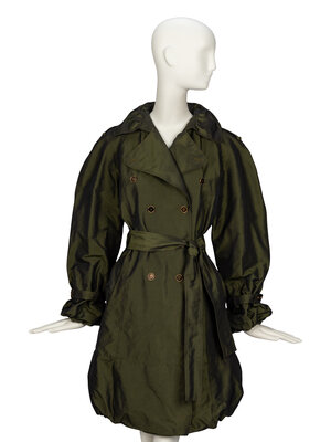 Knee-length trench coat in deep green shot polyester. Notched lapels & spread collar. Raglan sleeves with epaulettes at shoulders, buttoned belts at wrists, and elasticated bubble cuffs. Two welt pockets at front. Self-fabric removable belt. Elasticated bubble hem. Double breasted button closures at front. Fully lined.