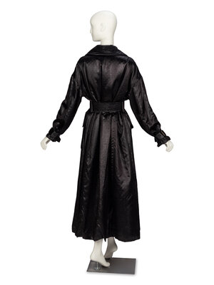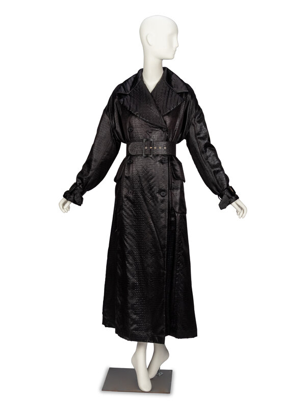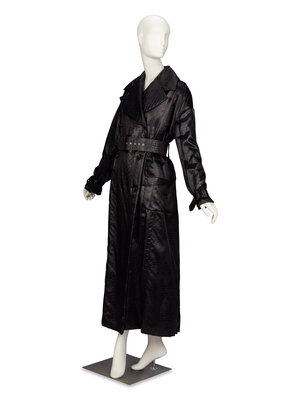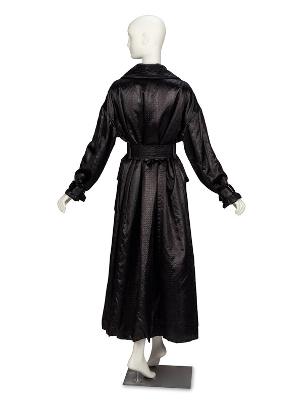 Long overcoat in black crocodile-embossed acetate. Wide notched lapels & spread collar. Full-length sleeves with belted cuffs. Two large patch pockets with flaps at hips. Double breasted button closures at front. Removable self-fabric & pleather belt. Quilted lining.