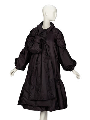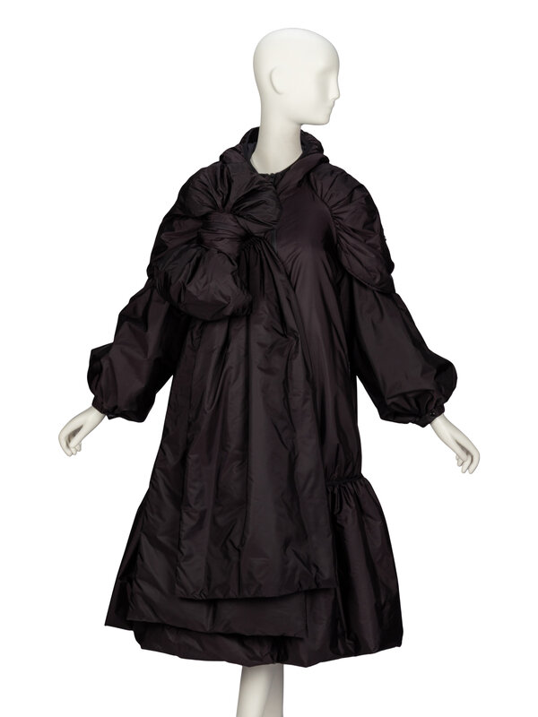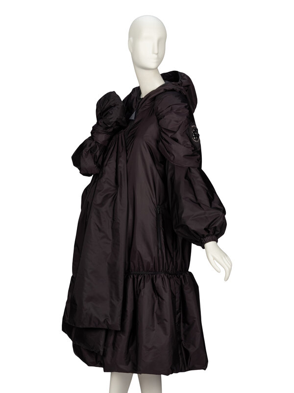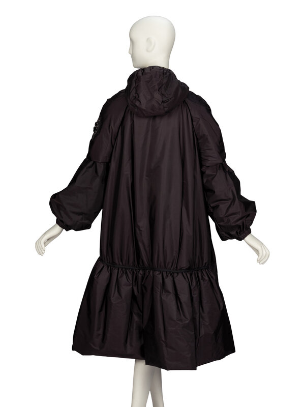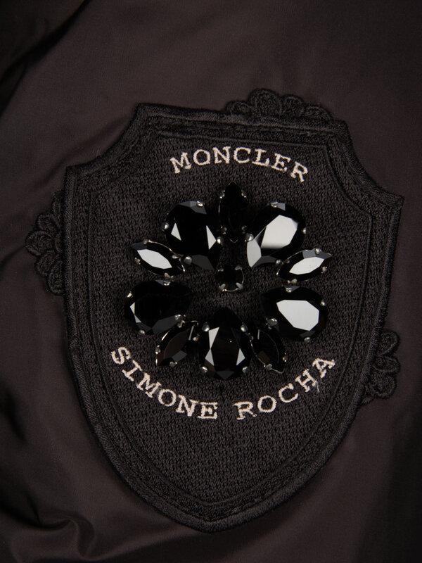 A-line puffer coat in down-filled black nylon. Round neckline with elasticated-edge hood. Full-length raglan bishop sleeves with elasticated adjustable cuffs with snaps; gathered overlay at shoulders. Features embroidered & beaded "Moncler / Simone Rocha" patch at upper arm. Oversized self-fabric bow with long 'ties' at upper chest. Gathered tier at lower half of dress. Double-ended zipper closure at front. Fully lined.