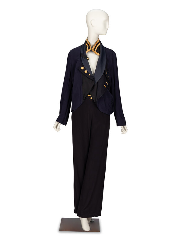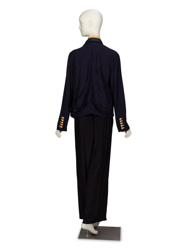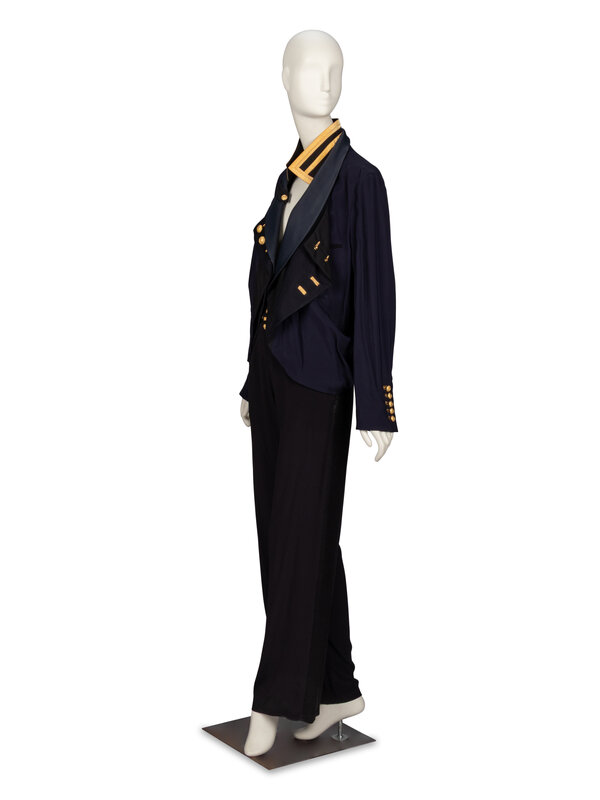 Naval-inspired open-front jacket in navy viscose, rep, and tricotine. Layered shawl collars at front, outermost with decorative gold-tone buttons and embroidered buttonholes. Stand collar around neck with gold appliqués at edges. Full-length sleeves working gold-tone buttons and embroidered buttonholes at cuffs. Partially lined.