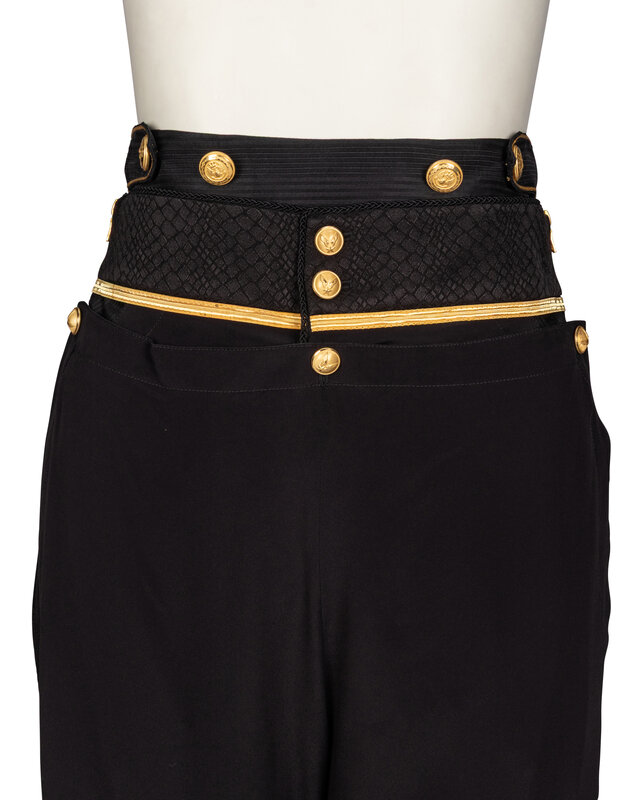 Naval-inspired sailor pants in navy acetate/silk-blend crêpe de chine and jacquard. Gold flat appliqués & black passementerie details at waist. Two exposed zipper closures and system of button closures at front. Two welt pockets at front. Partially lined.