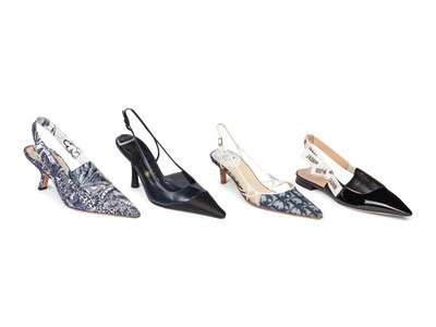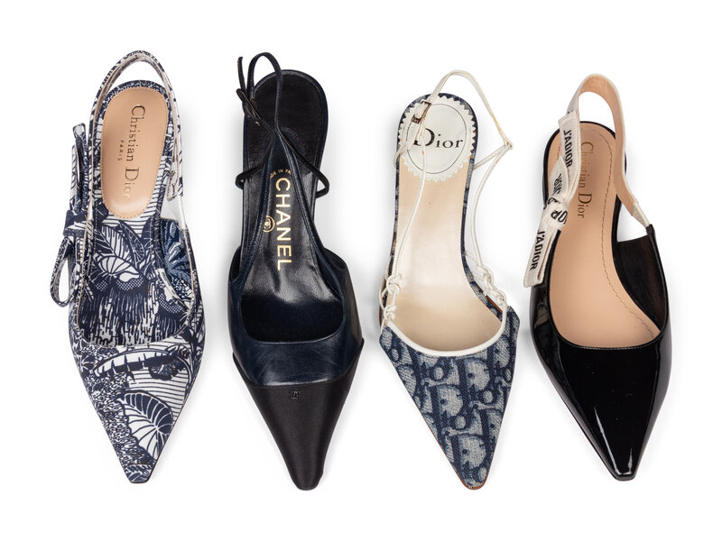 Slingback kitten heels in blue Dior Oblique canvas. White leather trim & straps. Pointed toe and low heel.