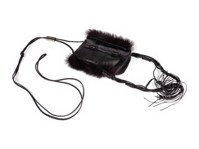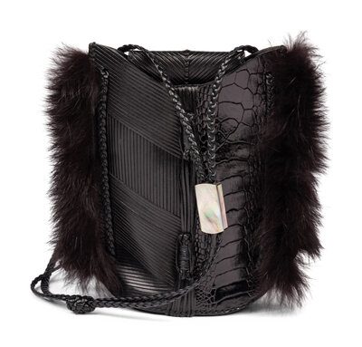 Mini shoulder bag in black leather, black crocodile skin, and black fur trim. Flap closure and braided leather strap.