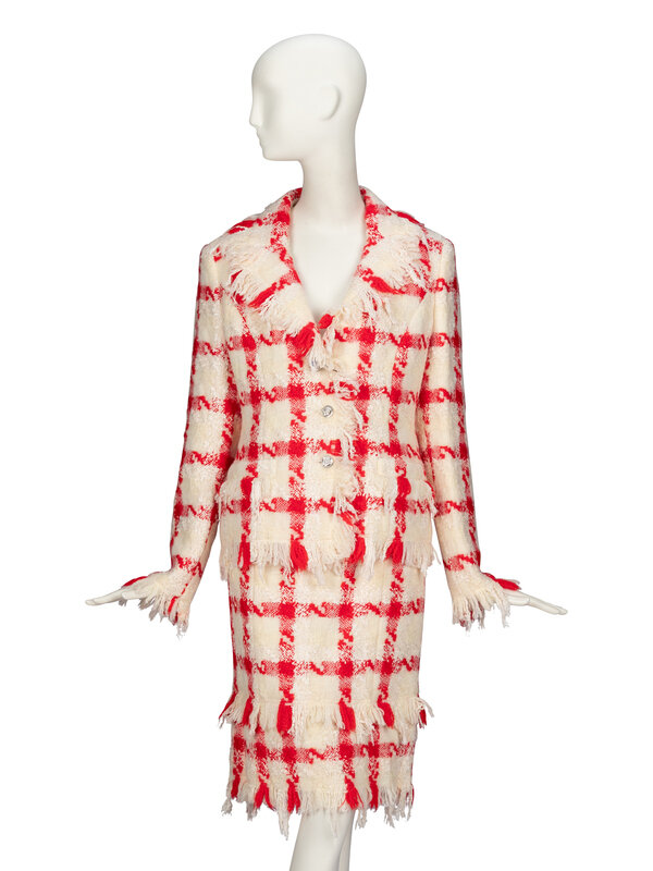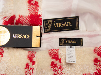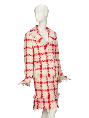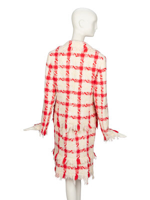Tailored jacket in red & white plaid wool-blend bouclé tweed. Frayed fringe trim throughout. Notched lapels. Full-length set-in sleeves. Light padding at shouldes. Two patch pockets. Button closures at front; features three silver-tone Medusa buttons. Fully lined.