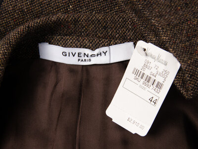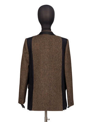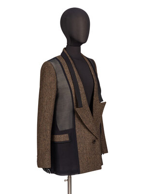 Tailored jacket in wool Donegal tweed; features black silk chiffon panels throughout, exposing interior construction. Long shawl collar with low notched & pointed lapels. Light padding at shoulders. Full-length set-in sleeves with decorative buttons at cuffs. Two welt pockets with flaps at front. Single low button closure at front. Fully lined.