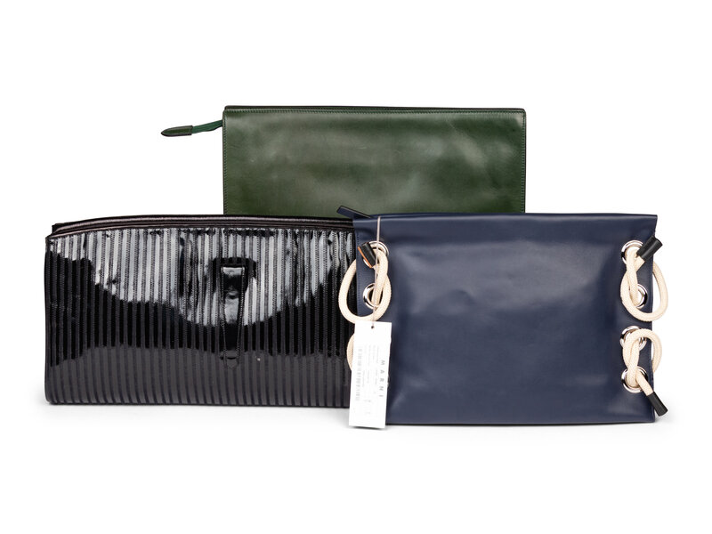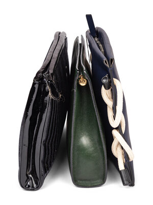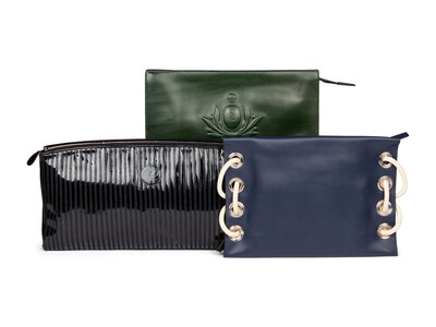 'Satelite' clutch in navy blue calfskin leather with laced/knotted rope & grommet details at sides. Zipper closure.