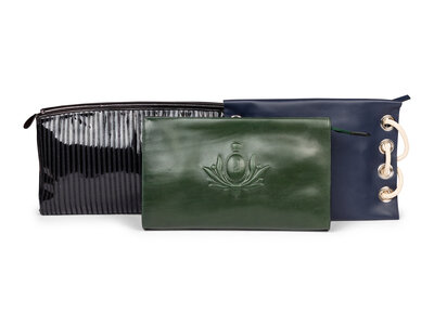 Clutch in black patent leather with zig-zag stitching details and black leather trim. Zipper closure and flat handle at back of clutch.