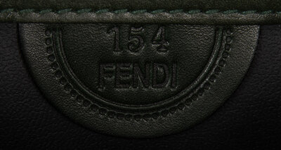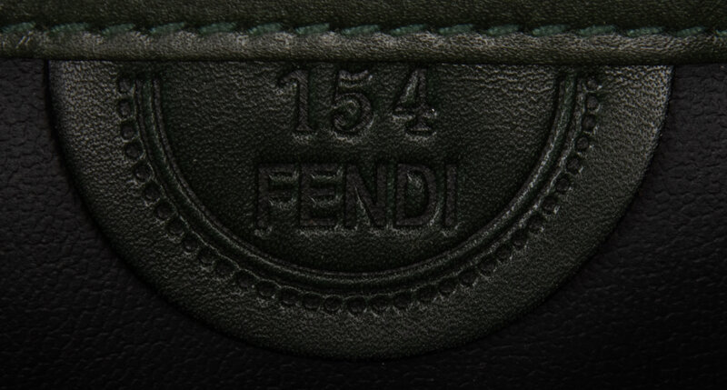 Clutch in dark green leather with embossed Fendi insignia at front. Zipper closure.