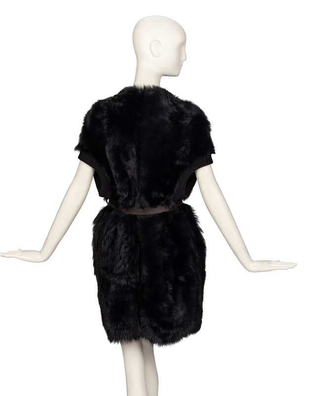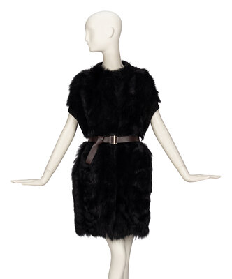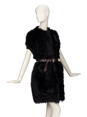 Long sleeveless vest in skin-to-skin black brushed lambswool/lambskin. With removable deep brown leather belt. Round collarless neckline. Dropped shoulders. Black wool ribbing at armholes. Straight silhouette. Three hook-and-eye closures at front. Sueded lambskin self lining.