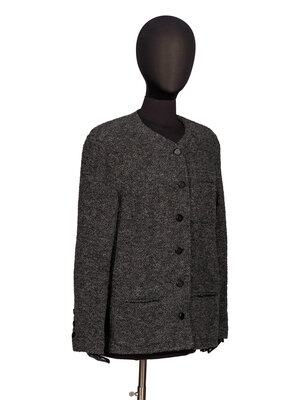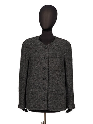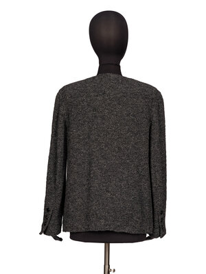 Cardigan jacket in marled grey wool/alpaca blend bouclé tweed. Round collarless neckline. Padding at shoulders. Full-length set-in sleeves with working three-button closures at sleeve hems. Three patch pockets at front. Button closures at front with matte black metal buttons. Metal chain at hem interior. Unlined.