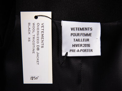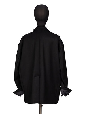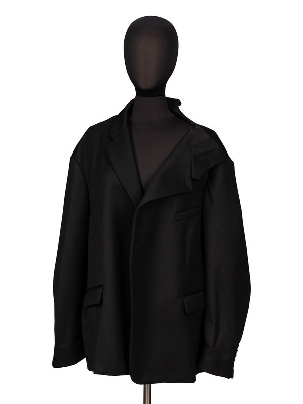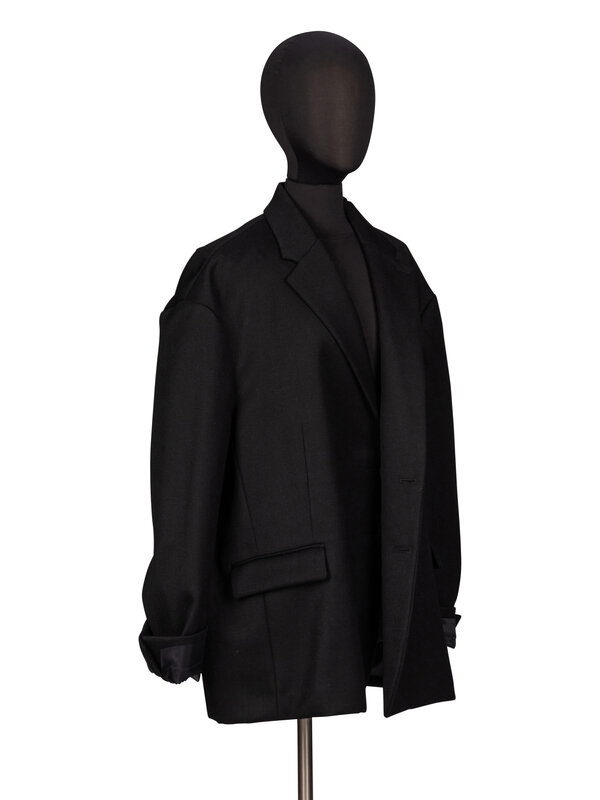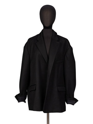 Oversized blazer in black wool tricotine. Notched lapels. Extra long sleeves with decorative buttons at cuffs. Invisible zipper at left shoulder seam. Two welt pockets with flaps at hips; one upper chest welt pocket. Two sets of button hole closures; one set of buttons at jacket interior. One interior welt pocket. Fully lined.