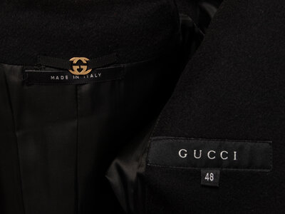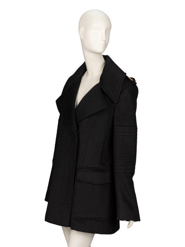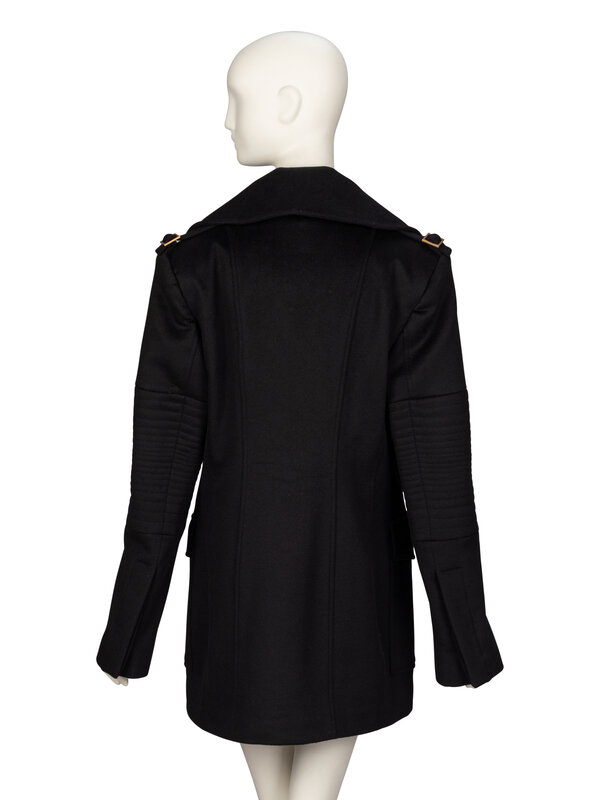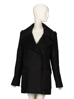 Short coat in black wool/cashmere-blend fabric. Wide collar & notched lapels. Full-length set-in sleeves with concealed button closures at sleeve hems. Padding at shoulders and epaulettes with gold-tone metal buckles. Two in-seam pockets at front waist; two patch pockets with flaps at hips. Concealed button closures at front. Fully lined.