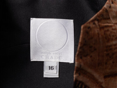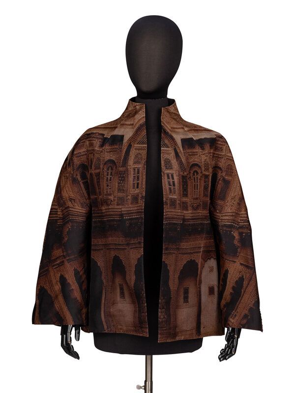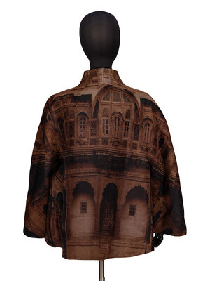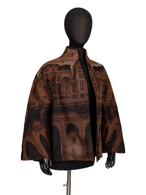 A-line jacket in silk organza with all-over Asian architectural print. Built-up stand collar. Incorporated kimono sleeves. Rounded hemline, dips slightly lower in back. Decorative topstitching throughout. No closures. Fully lined.