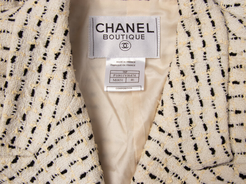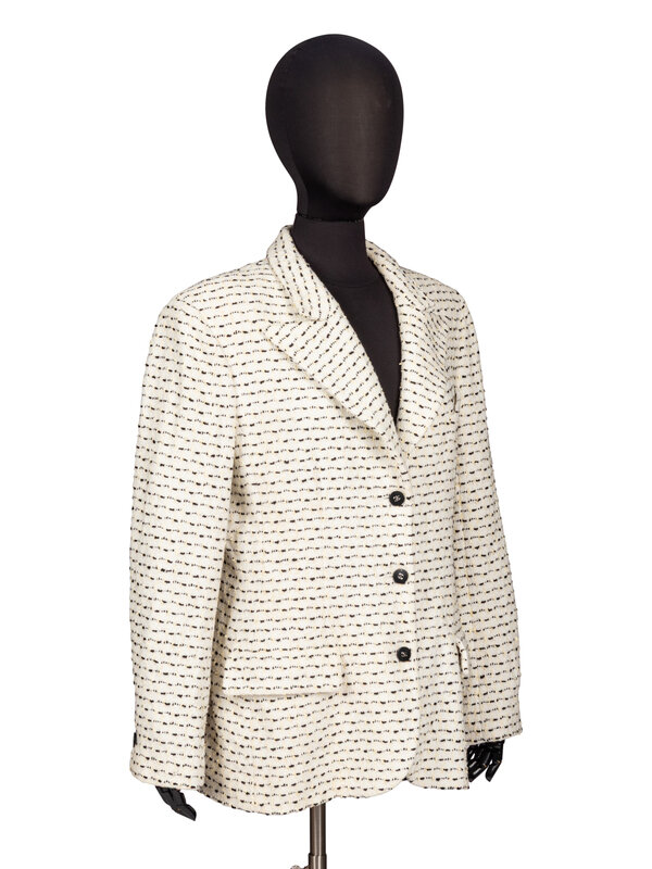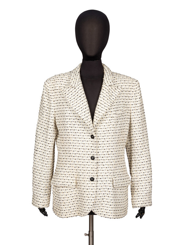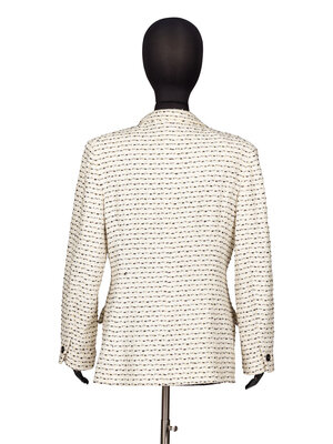 Lightly tailored jacket in white & black-striped cotton-blend tweed. Peaked & notched lapels. Padding at shoulders. Full-length set-in sleeves with single button closures at sleeve hems. Two welt pockets with flaps at front. Three button closures at front. Metal chain at interior hem. Fully lined.