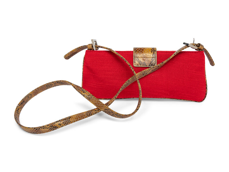 Baguette bag in scarlet red canvas and python-effect embossed leather with silver-tone hardware. Zipper closure & magnetic clasp closure. Flat leather strap.