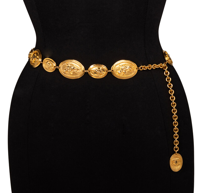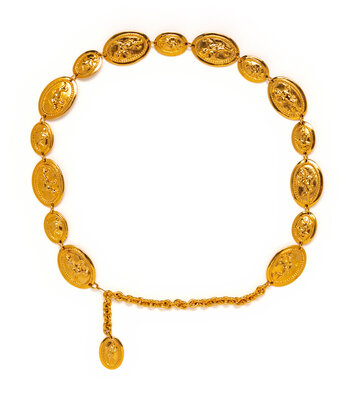 Medallion chain belt in gold-tone metal. Features oblong medallions with reliefs of cherub figures. Dangling medallion with cherub & CC insignia.