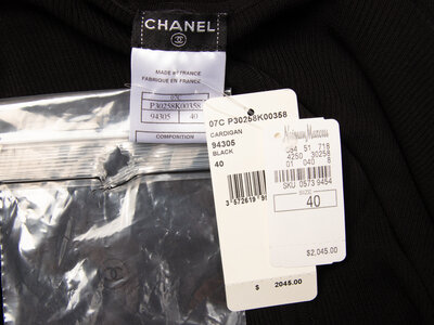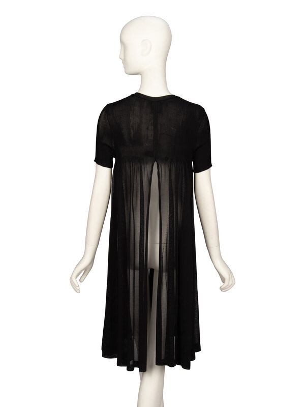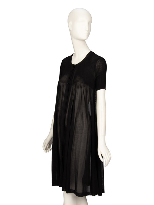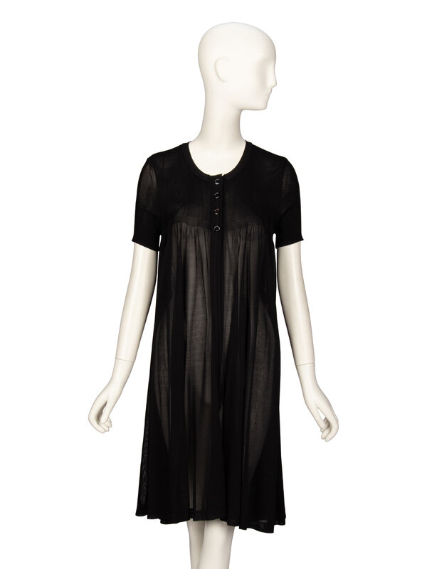 Knee-length topped in semi-sheer black knit viscose. Empire waistline. Collarless, round neckline. Short sleeves. Flared skirt. Button closure at front, to empire waist; slit at front and back skirt up to waistline. Unlined.