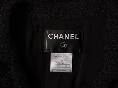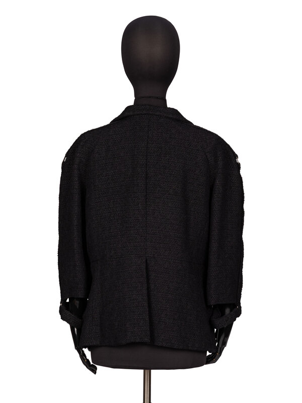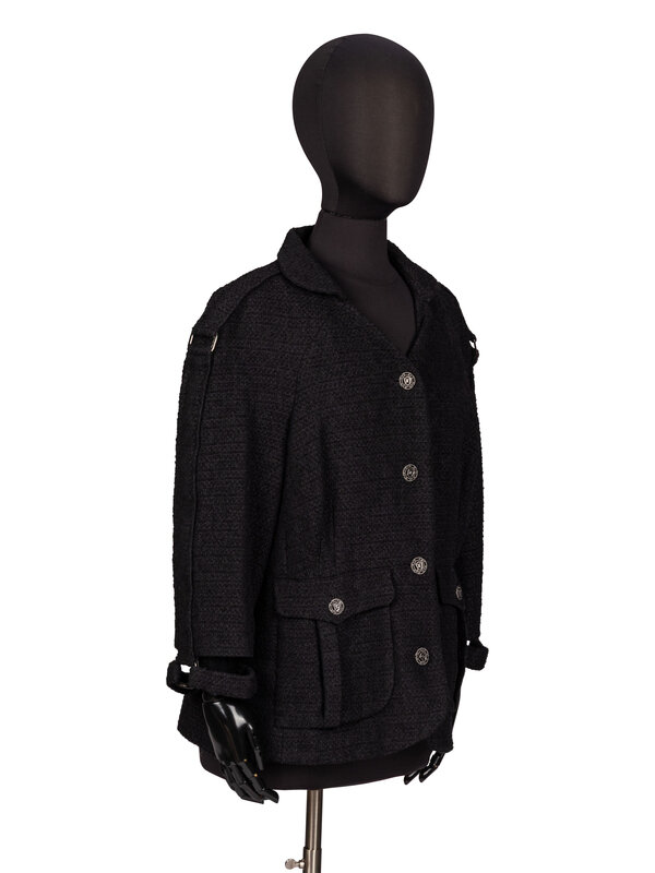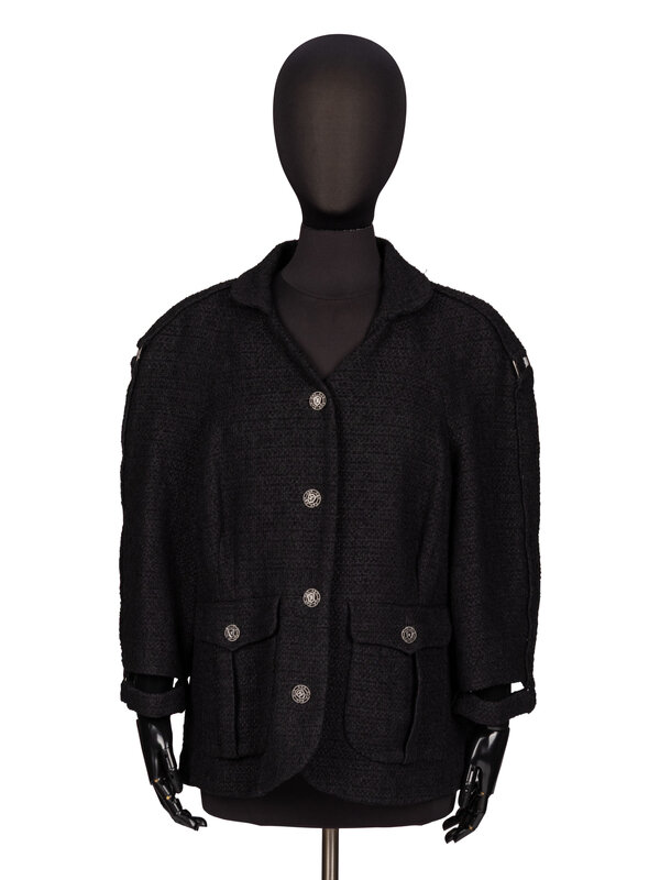 Boxy jacket in black cotton-blend tweed. V neckline & rounded collar. Three-quarter-length raglan sleeves with cut-out belted details at sleeve cuffs. Epaulettes at shoulders. Two patch pockets at front with buttoned flap closures. Button closures at front. Metal chain at interior hem. Fully lined in black silk jacquard.