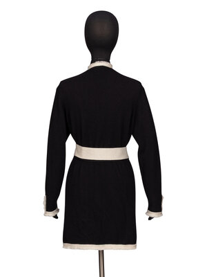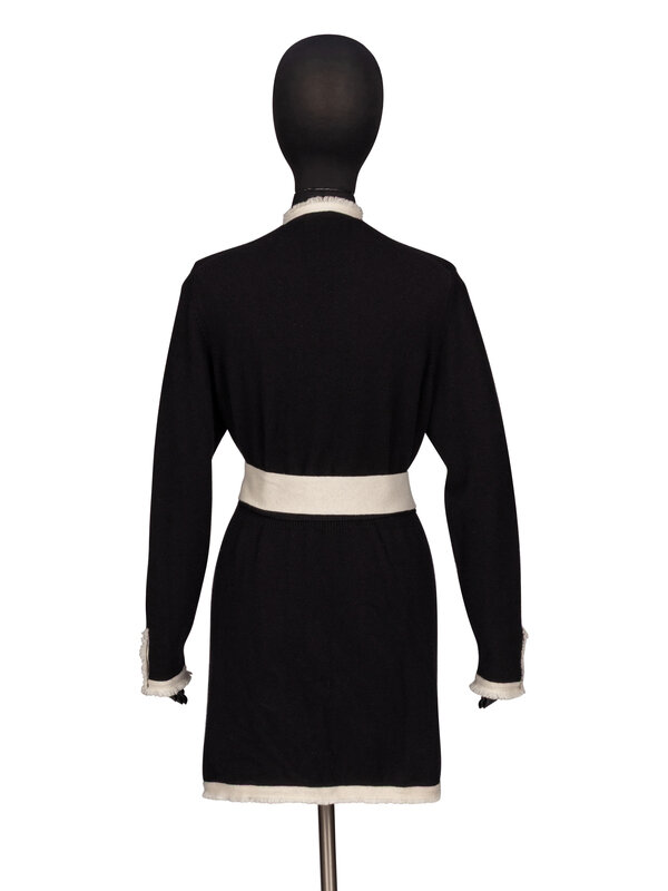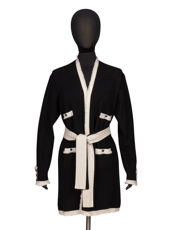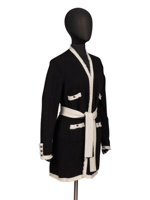 Duster cardigan in black & off-white cashmere knit. Frayed fringe trim throughout. Collarless neckline. Full-length sleeves with working three-button closures at sleeve hems. Four patch pockets at front with button closures. With two detached black & off-white self-fabric belts. Unlined.