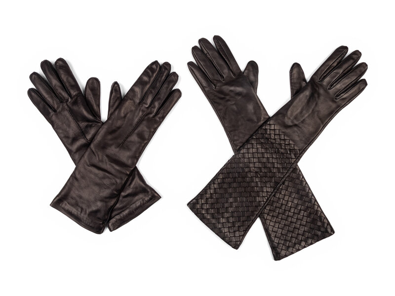 Below-elbow length gloves in black lambskin leather with intrecciato woven details at arms. Fully lined in black silk jersey.