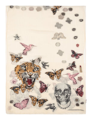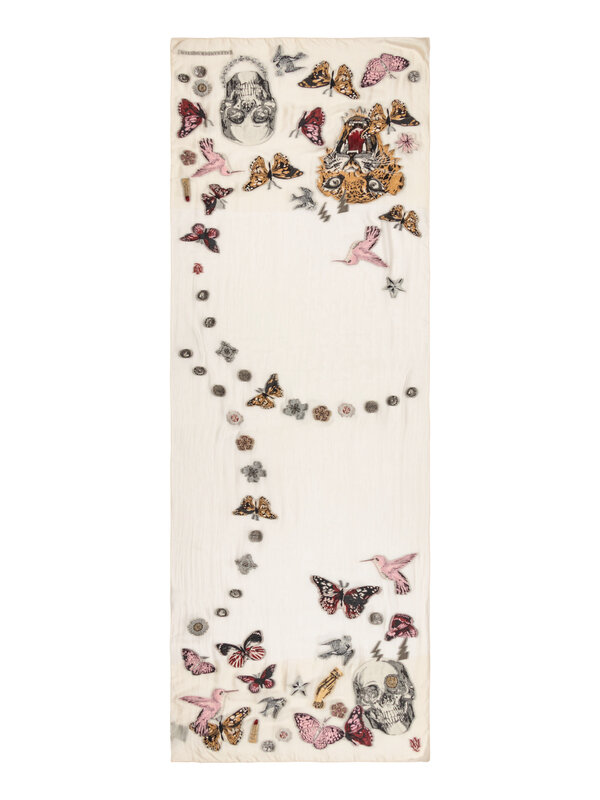 27.5" x 70" scarf in beige silk-blend chiffon with woven jacquard motifs throughout. Hand-rolled and stitched edges.