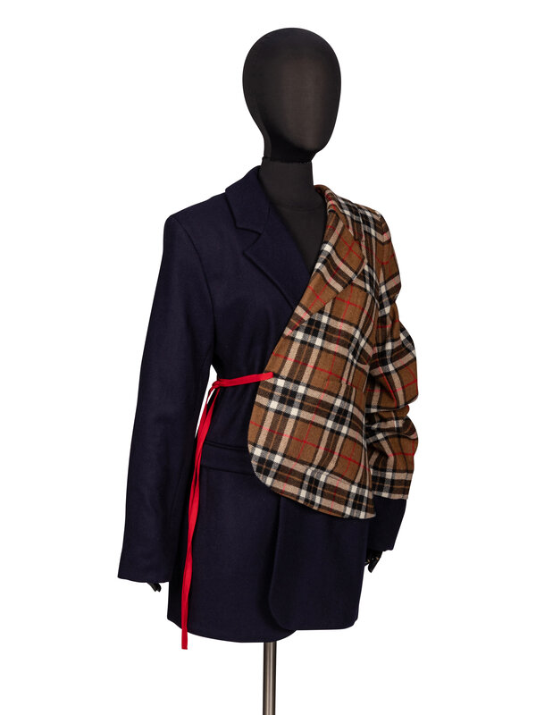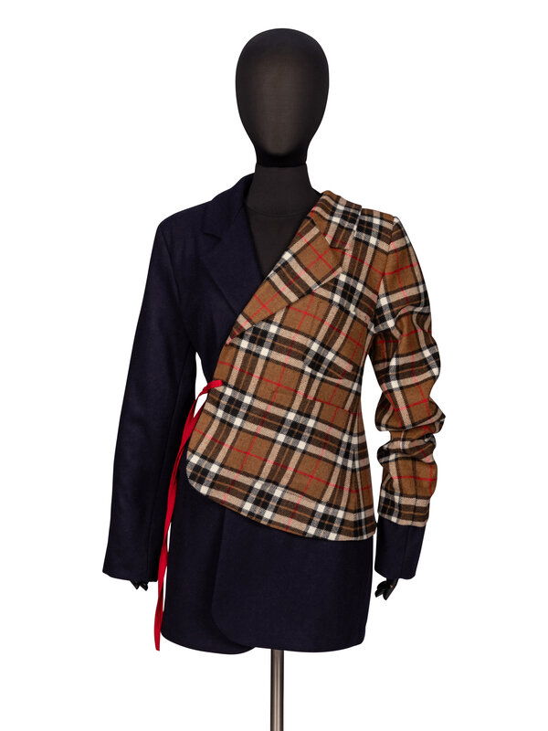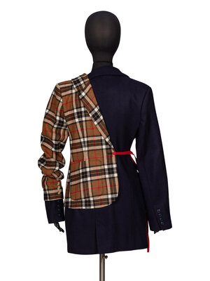 Asymmetric tailored jacket in navy blue felted wool with an overlaid & attached jacket in a brown plaid wool. Button closure at front, with attached long red ties at the side waist to fasten overlaid jacket at front & back. Features patch and welt pockets, notched lapels, full length sleeves with decorative buttons at cuffs, and ruching to one sleeve. Fully lined.