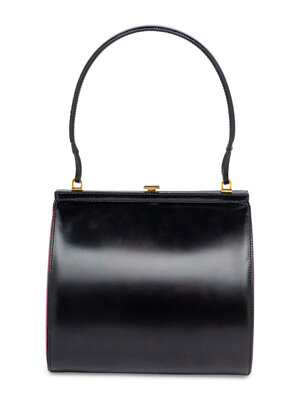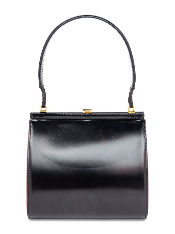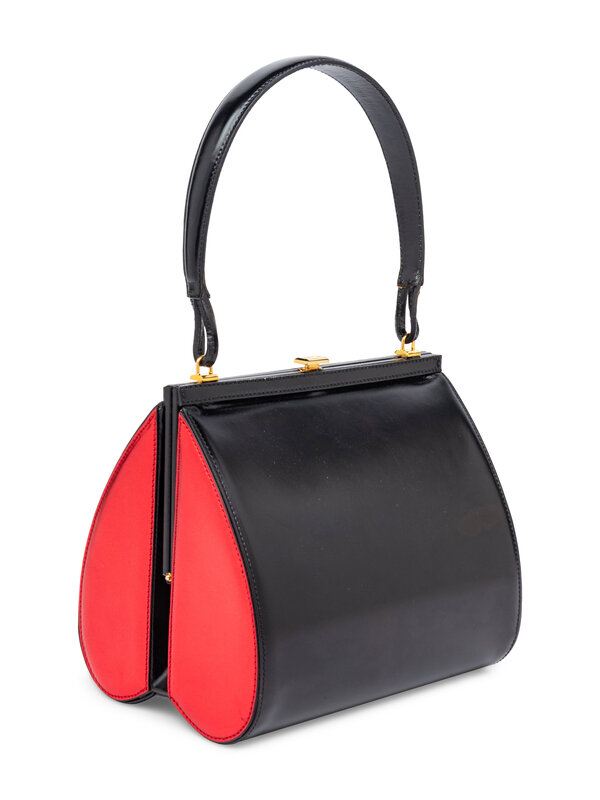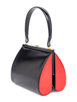 Upside-down heart bag in black & metallic red leather with gold-tone hardware. Push-lock closure and leather handle.