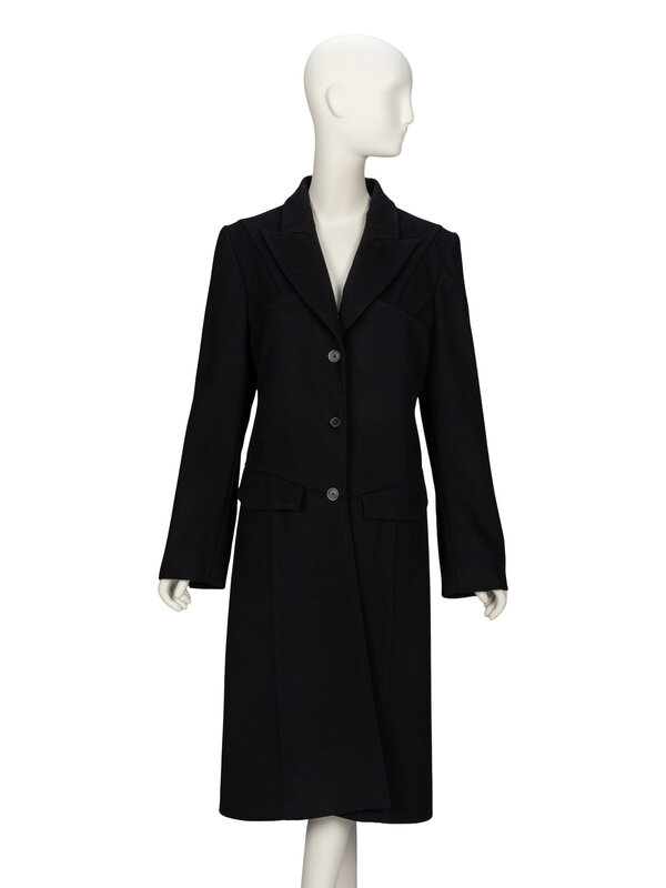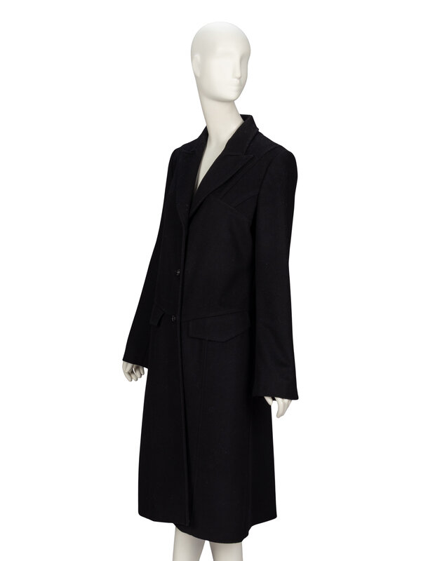 Tailored coat in black felted wool/cashmere-blend coating. Peaked notch lapels. Padding at shoulders. Full length inset sleeves with concealed working button closures at cuffs. Two welt pockets at front with flaps. Three button closures at front. Fully lined.